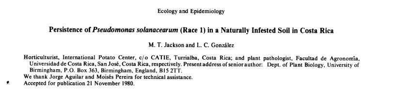So, PhD under my belt so-to-speak, Steph and I returned to Lima just before New Year 1976. Later in April that year, we moved to Costa Rica where I did research on a serious bacterial disease of potatoes, seed potato production, and co-founded a pioneer regional cooperative program on potato research and development. We remained in Costa Rica for almost five years before returning to Lima, and from there to The University of Birmingham.