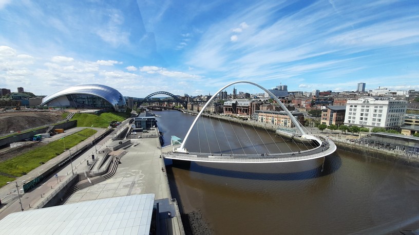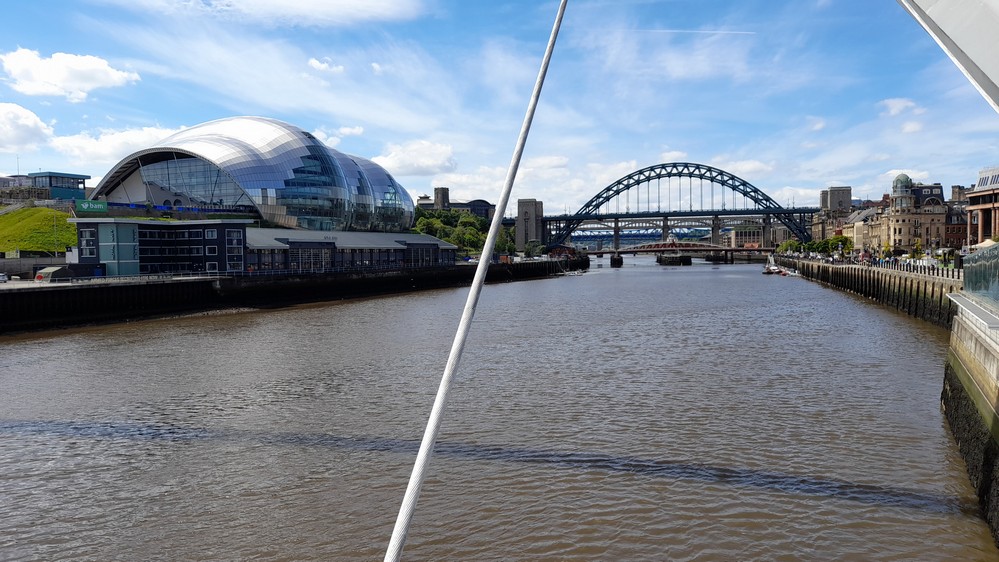 View west along the River Tyne from Baltic (a contemporary art center), with the Glasshouse International Centre for Music on the left, and the Millennium and Tyne Bridges (and others) connecting Gateshead with Newcastle on the right.
