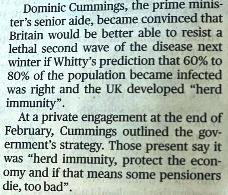 If true, this is an appalling perspective from the Prime Minister’s Chief Adviser Dominic Cummings (whose credibility among a large swathe of the population has already taken a dive).