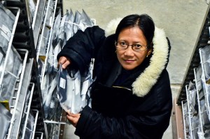Steph checking potatoes in the CIP germplasm collection in one of the screenhouses at La Molina