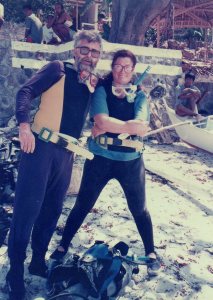 L: About to plunge backwards into the IRRI pool on 6 March 1993; R: With PADI course classmate Crissan Zeigler at Anilao after successfully completing the four Open Water training dives on 14 March 1993.