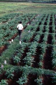 Ing. Jorge Esquivel (MAG) and me screening potatoes for virus resistance in a field trial on the slopes of the Irazú volcano in Costa Rica, while my assistants Jorge Aguilar and Moisés Pereira check plants nearby.