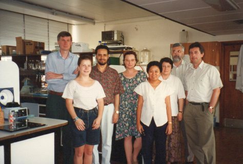 Standing, L-R: Zofia Bulinska-Radomska (Poland), Mike Jackson, ??, ??, ??, ??, George Ayad (Egypt, IBPGR), Rainer Freund (Germany), Bruce Tyler (WPBS), Amos Dinoor, ??, Luis Gusmao (Portugal). Front row, L-R: Krystina ?, ??, Brazilian MSc student, Gideon Ladizinsky, Ayfer Tan (Turkey), Margarida Texeira (Portugal).