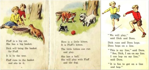 Like most other children in the 1950s my first reading primers were the Dick and Dora books (or similar), with their dog Nip and cat Fluff. I haven’t yet found information about the publishers or how many primers were produced. Here’s an example of what we worked with.