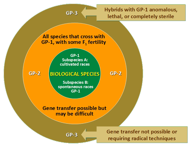 Although this research had a ‘taxonomic’ focus in one sense (figuring out the limits of species to one another), it also had the practical focus of demonstrating how easily species might be used in plant breeding, according to their breeding relationships, based on the genepool concept of Harlan and de Wet, 1971 [1], illustrated diagrammatically below.