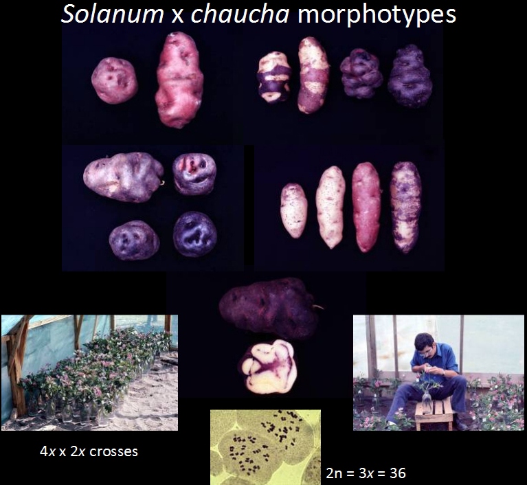 My own biosystematics/pre-breeding PhD research on potatoes looked at the breeding relationships between cultivated forms with different chromosome numbers (multiples of 12) that don’t naturally intercross freely, as well as diversity within one form with 36 chromosomes, Solanum x chaucha. In the image below, some of that diversity is shown, as well as examples of how we made crosses (pollinations) between different varieties, using the so-called ‘cut stem method’ in bottles.