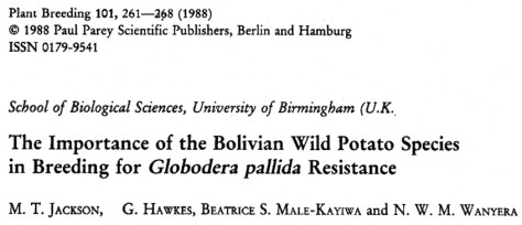Jackson, M.T., J.G. Hawkes, B.S. Male-Kayiwa & N.W.M. Wanyera, 1988. The importance of the Bolivian wild potato species in breeding for Globodera pallida resistance. Plant Breeding 101, 261-268. PDF [17]