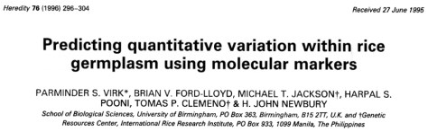 Virk, P.S., B.V. Ford-Lloyd, M.T. Jackson, H.S. Pooni, T.P. Clemeno & H.J. Newbury, 1996. Predicting quantitative variation within rice using molecular markers. Heredity 76, 296-304. PDF [233]