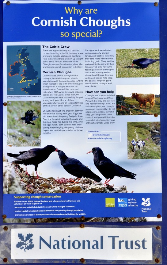 As we approached the view over Housel Bay and a collapsed cliff, I saw these black birds suddenly fly up from a nearby pasture. A few minutes later we were watching a pair of choughs (which feature on the Cornish coat of arms) on the rocks below. What a joy, since choughs are no longer common in Cornwall, and have only recently begun to re-establish themselves once cattle grazing practices had reverted to what was common before the chough decline. There are now about 100 breeding pairs of choughs in the county. A success story.