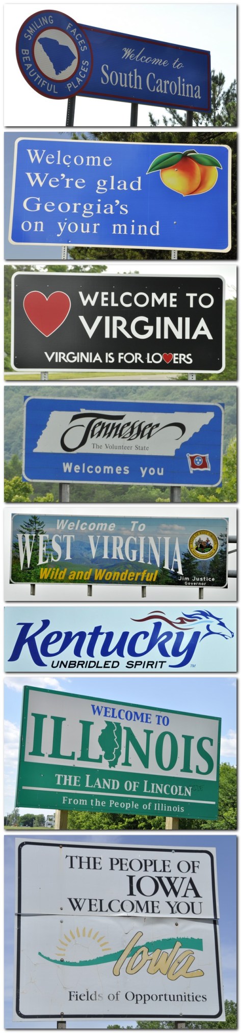 US states are not immune. As we travelled around the eleven states on our journey from Georgia to Minnesota in June this year, I took photographs of all the state signs at the state lines (except Kentucky – I had to find its brand logo elsewhere). Each of the eleven (with the exception of North Carolina, Missouri, and Minnesota) had a brief slogan to describe itself, such as Virginia is for Lovers, or Wild and Wonderful (West Virginia).