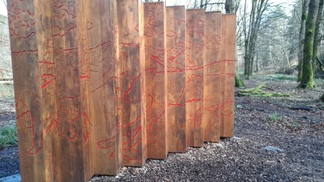 Along the path beside the Garden Pond, there’s a newly installed sculpture of an owl, carved from one of the downed trees, standing in open woodland (mainly of beech) but with lots of understorey bushes.
