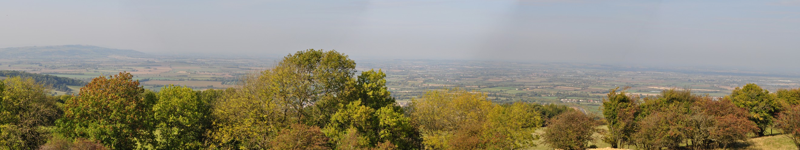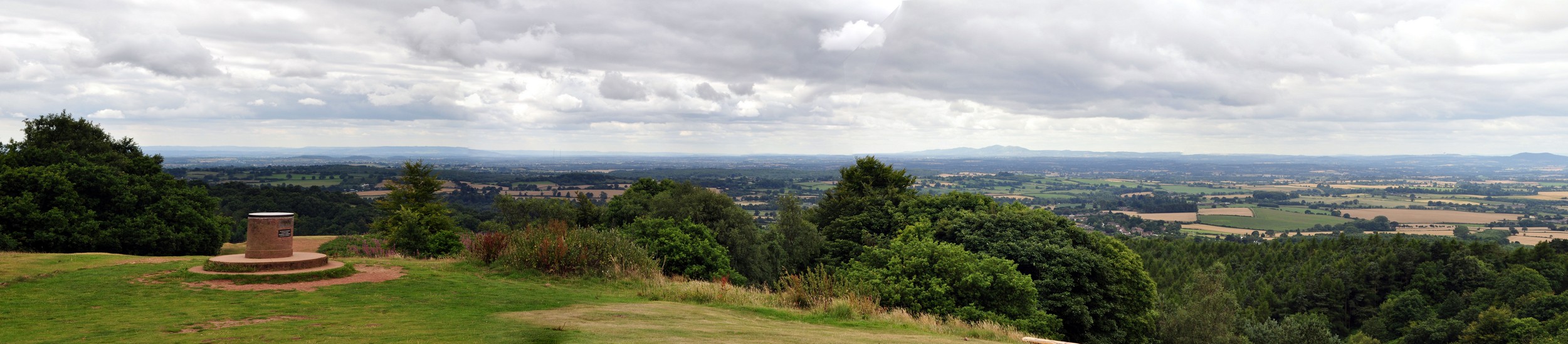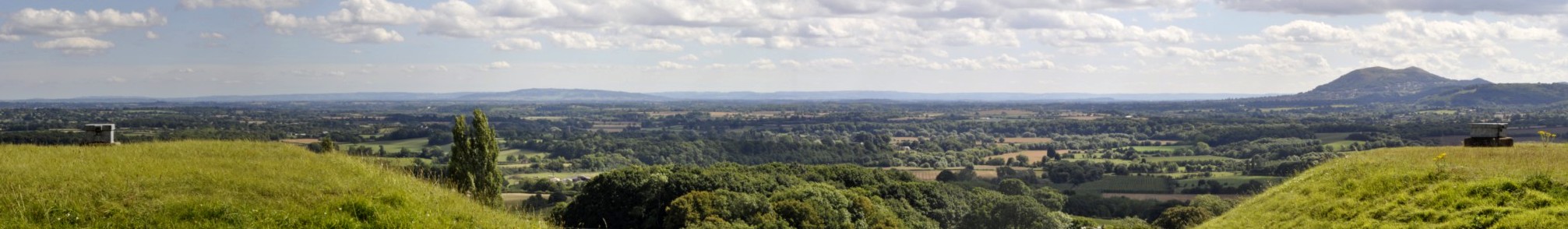 The view south towards the Malvern Hills (on the right), the Severn Estuary, and the Cotswolds (on the left).