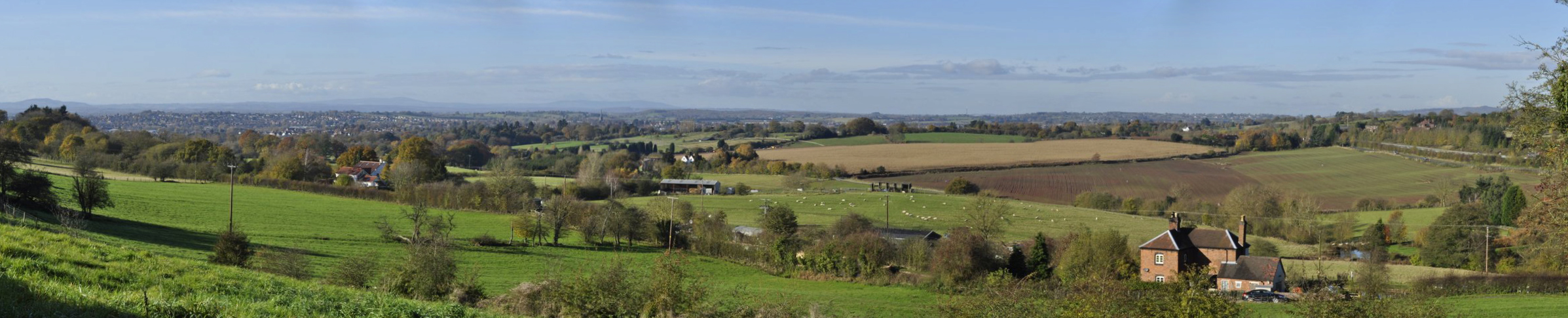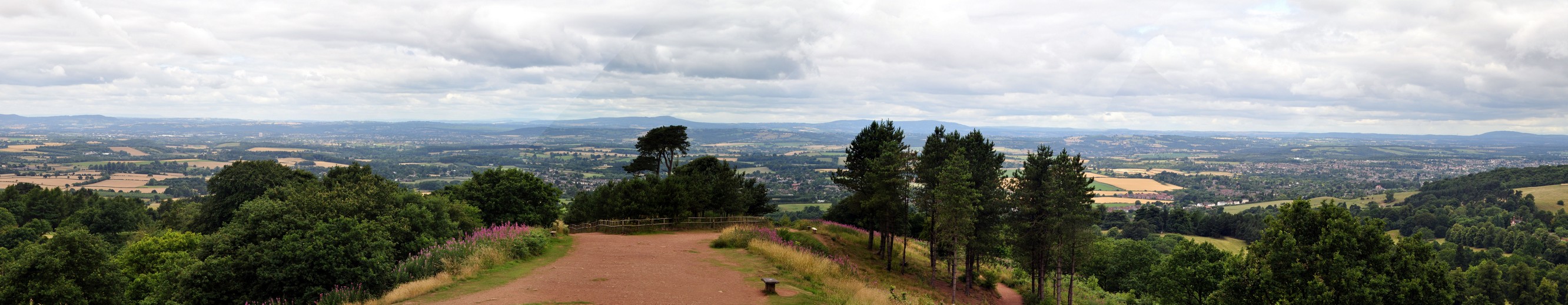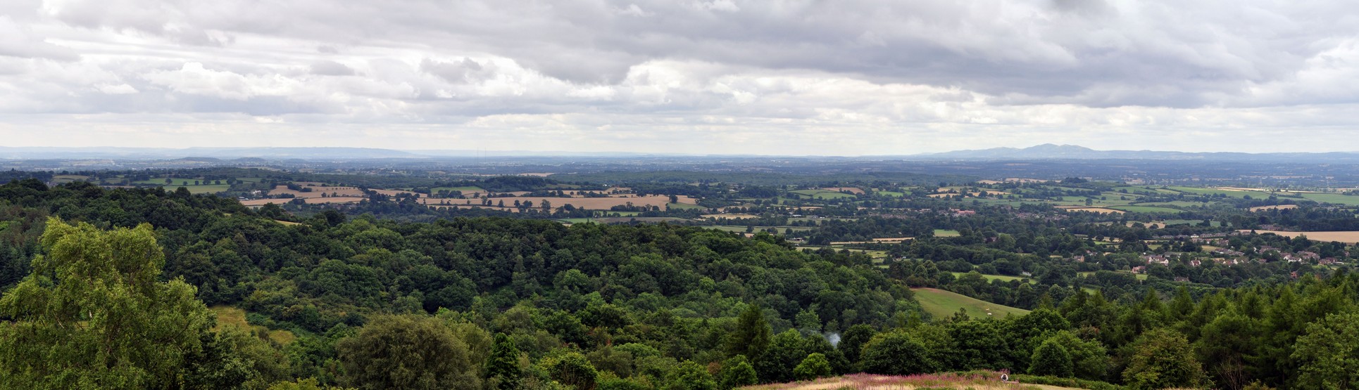 The view south towards the Malvern Hills (on the right), the Severn Estuary, and the Cotswolds (on the left).